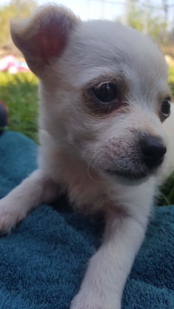 Three of the puppies and the momma dog were all adopted once the pups were old enough, but the little white scraggly one got left behind. We named her Snowball.